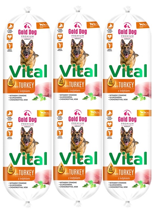 Baton mięsny Vital Adult Turkey 10x900g to pełnoporcjowa mokra karma dla psów , przygotowana ze świeżych surowców i wzbogacona o witaminy na stawy jako jedyny producent.